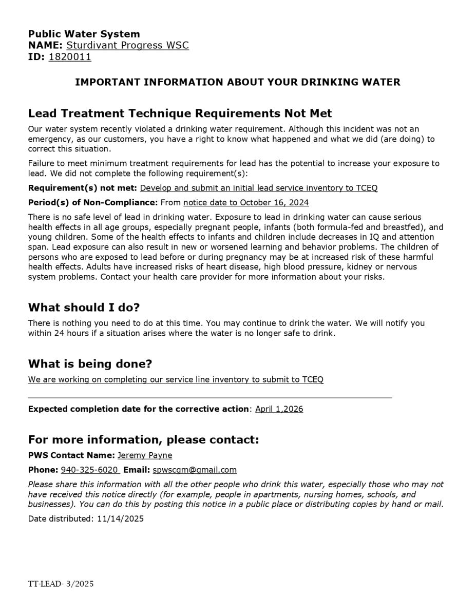 At Sturdivant Progress WSC, we are committed to providing safe, high quality water services to our community, while maintaining a standard of excellence in customer service and environmental conservation.